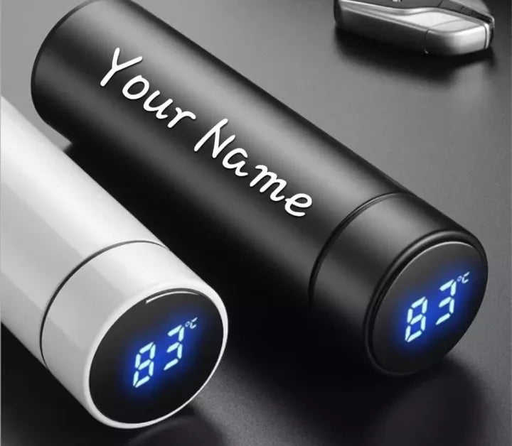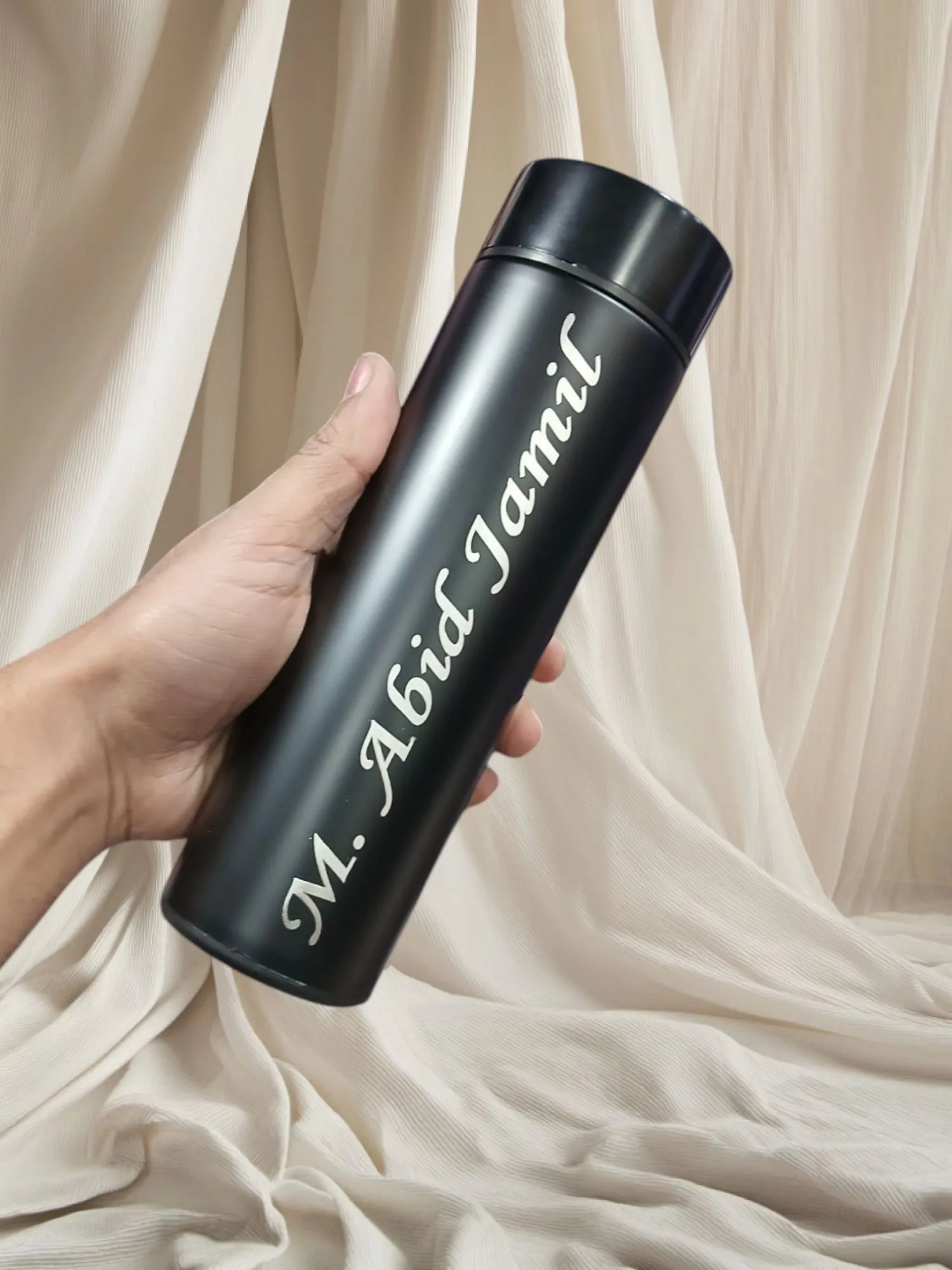 Very beautiful metalic vacuum bottles with engraved laser printing as per your requirement, we will print. Temp sensor water bottles